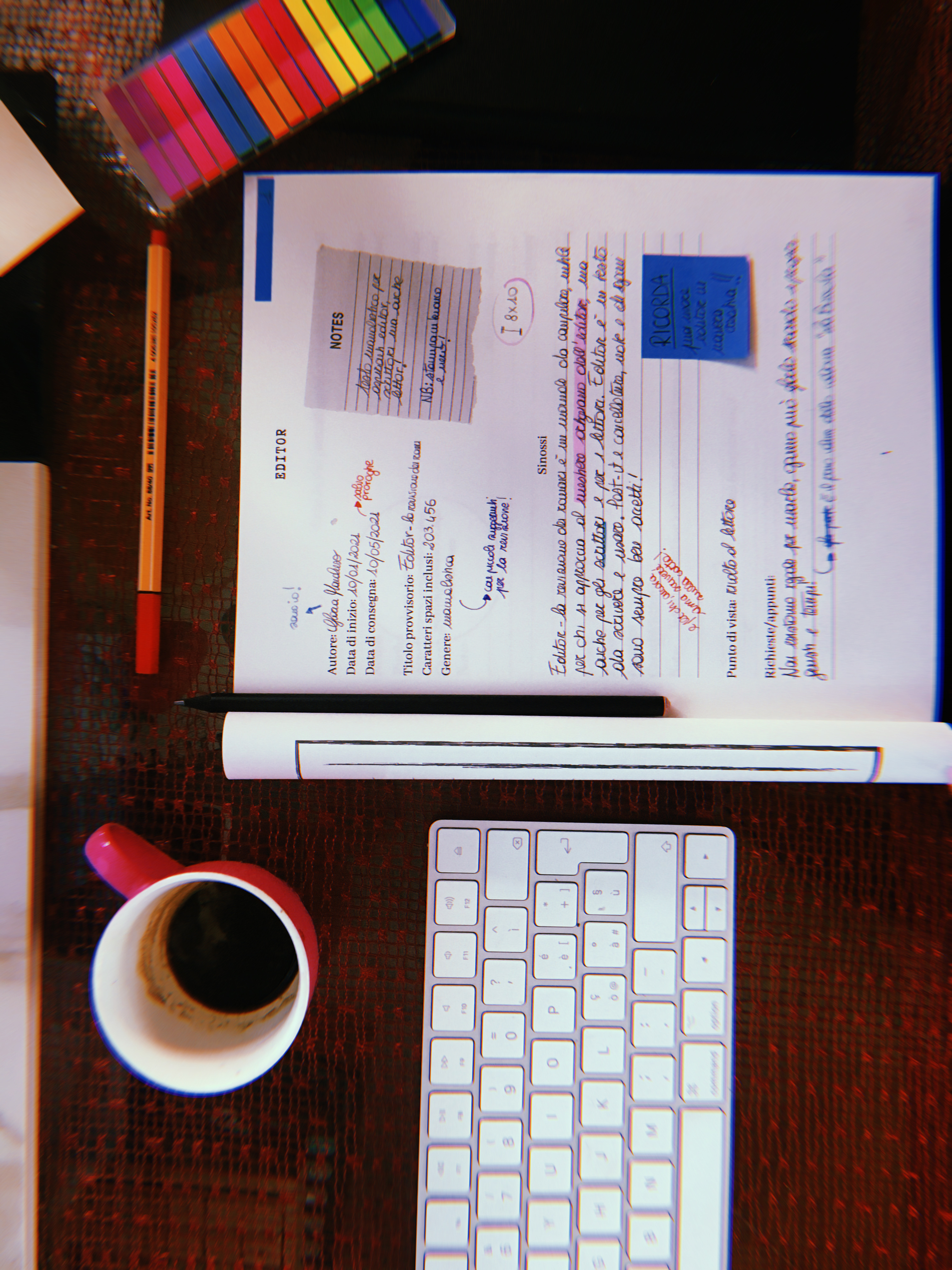 Il taccuino non è fatto per essere contemplato, nel carosello potete vedere la prima pagina di una scheda compilata: scrivete, disegnate, utilizzate i colori, appiccicate post-it, inserite cartoline. Ho pensato “Editor” come uno strumento creativo che raccolga i vostri lavori in un unico posto.