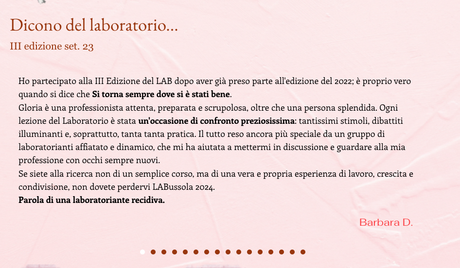 Di cosa si tratta? Durante il laboratorio di editing LABussola editeremo, insieme, un romanzo completo: parola per parola. Lo scopo del laboratorio, da sempre, è quello di formare aspiranti editor al lavoro sul testo, attraverso un confronto pratico su una storia e attraverso il confronto fra opinioni e metodi differenti. L’obiettivo ultimo del LAB è quello di indirizzare l’aspirante editor verso il raggiungimento di un approccio personale e originale, un metodo proprio di lavoro al testo che si possa distinguere nel mercato e nel rapporto con gli autori e con le autrici, con le Casa Editrici e le agenzie o i service editoriali.
